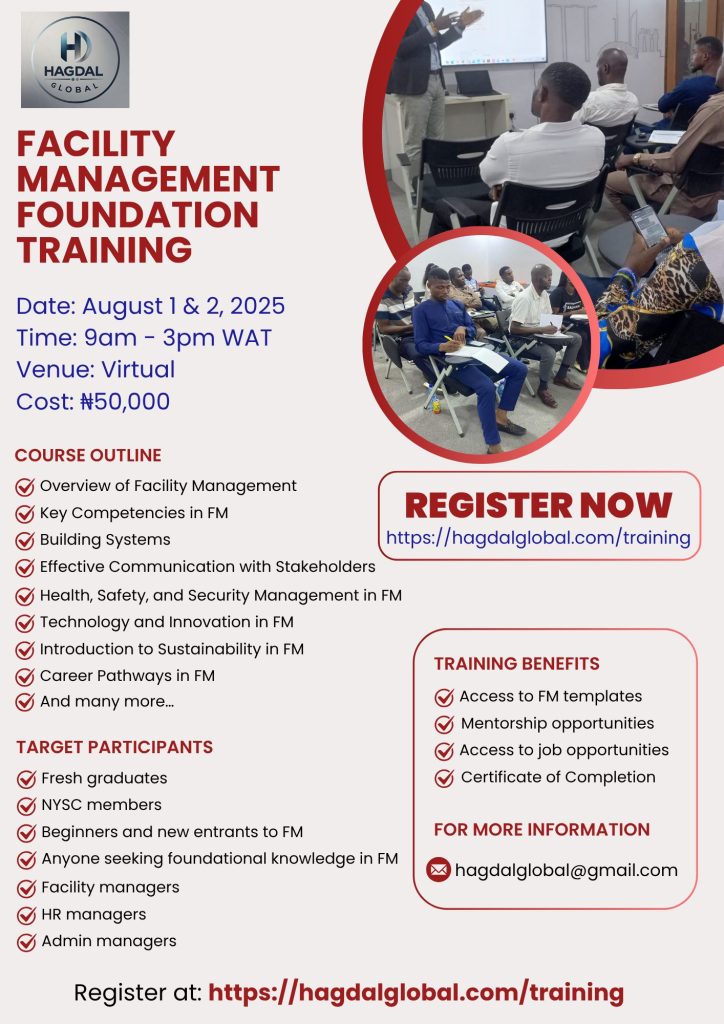 This training is designed to introduce participants to the fundamentals of Facility Management (FM), providing them with practical knowledge, tools, and templates to excel in the field. It is ideal for fresh graduates, NYSC members, beginners in Facility Management, and professionals transitioning into FM roles. Led by seasoned industry experts with over 30 years of combined experience, the training offers a blend of theory and real-world applications. Attendees will gain a clear understanding of FM concepts, the day-to-day responsibilities of facility managers, and how to optimize facility operations efficiently.